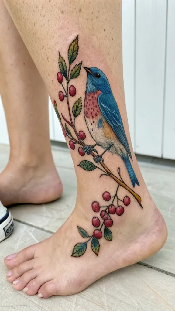 Pairing a bluebird with a berry branch creates a charming and whimsical tattoo design that’s full of life and symbolism.
