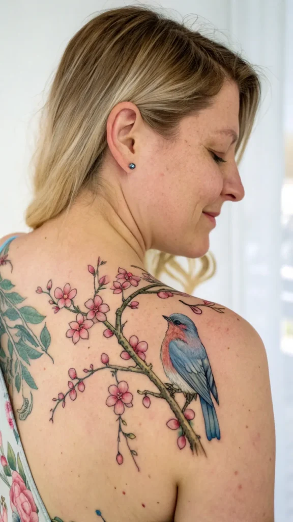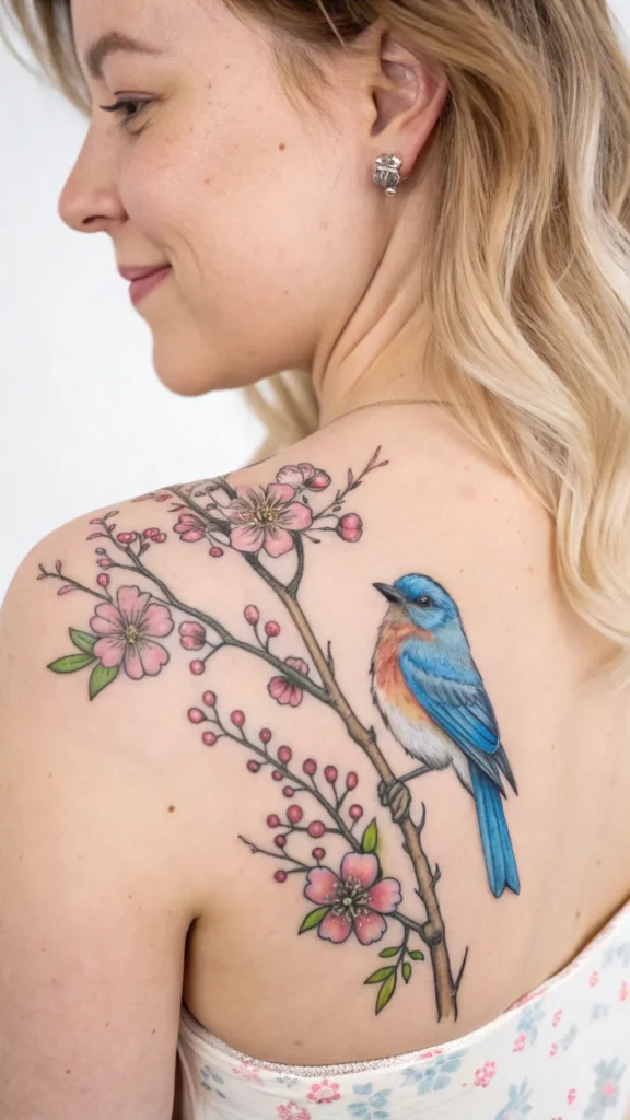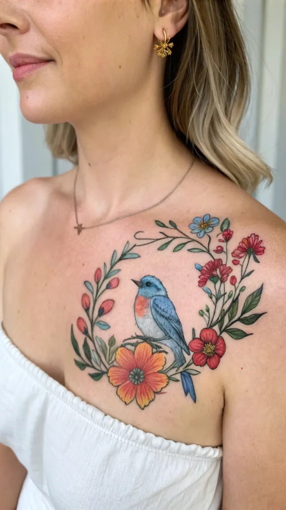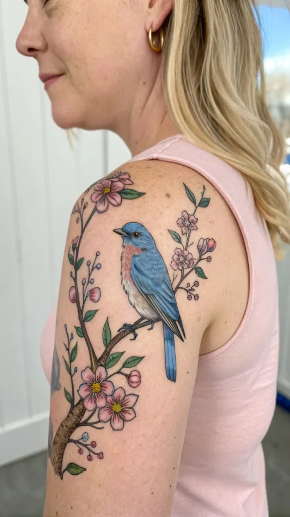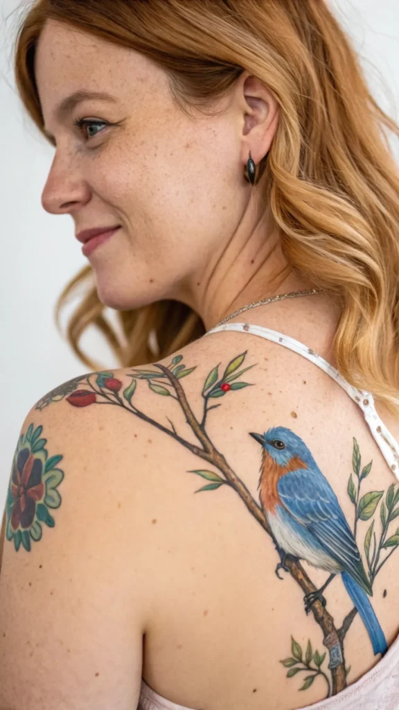 The key to a successful whimsical bluebird scene tattoo lies in striking a balance between the bird’s bold presence and the surrounding scenery.