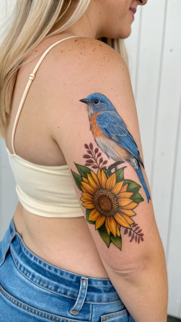 Incorporating a bluebird perched on a sunflower stem or surrounded by its bright yellow petals can add a sense of movement and energy to your tattoo.