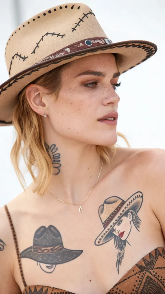 A classic Stetson or Resistol hat design can be paired with a bandana, lasso, or other Western motifs to create a tattoo that’s both visually striking and deeply meaningful.