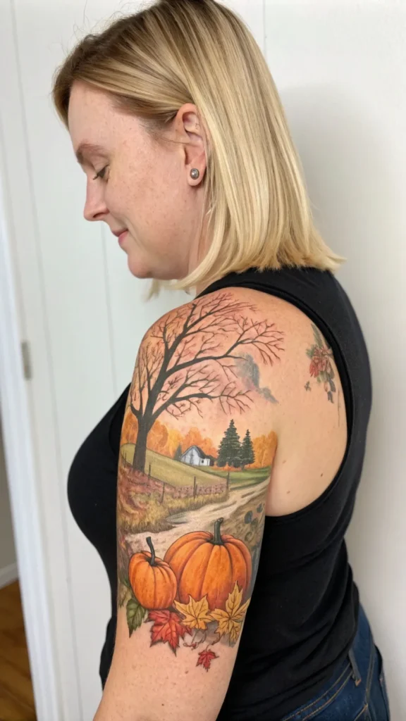 In an Autumnal Pumpkin Landscape tattoo, the pumpkin can be the central focus or a subtle element within the larger scene.