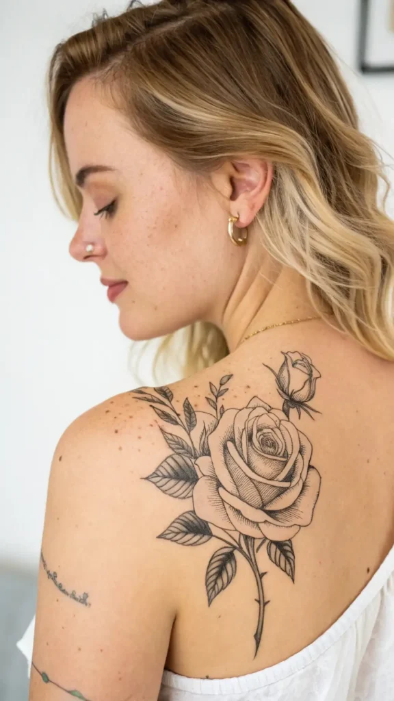 Delicate rose petal accents can help you achieve either look, making your tattoo a true reflection of your personality.